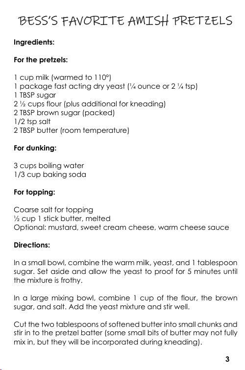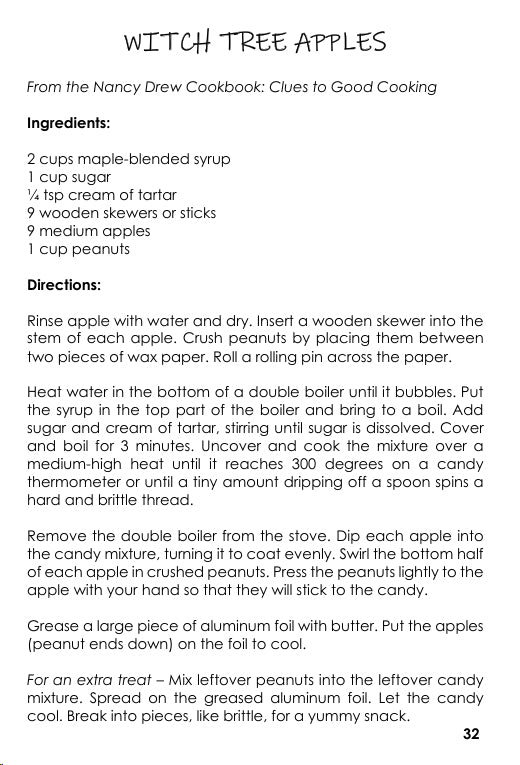 Leftover from our Nancy Drew Witch Tree Symbol Convention in Lancaster, PA - is this neat booklet style cookbook based on most of the foods mentioned in The Witch Tree Symbol, the book set in Amish Country. Color covers and black and white inside. Has 35 numbered pages. Features recipes in these categories: Breads, Pickling and Canning, Soups, Entrees, Desserts and Drinks. There was a lot of food mentioned and eaten in Witch Tree Symbol! Recipes include a lot of the great Amish and PA Dutch dishes and desserts fixed in the book including Fasnachts, apple desserts, and Shoofly Pie, but also a recipe for Amish Pretzels which are found all over the area and a couple of fall theme recipes from the Nancy Drew Cookbook including Witch Tree Apples. Materials: Paper, staples. Size: 5 1/2" x 8". Compiled by Nancy Drew Sleuths President, Jennifer Fisher. Included are 4 sample recipes from the cookbook.